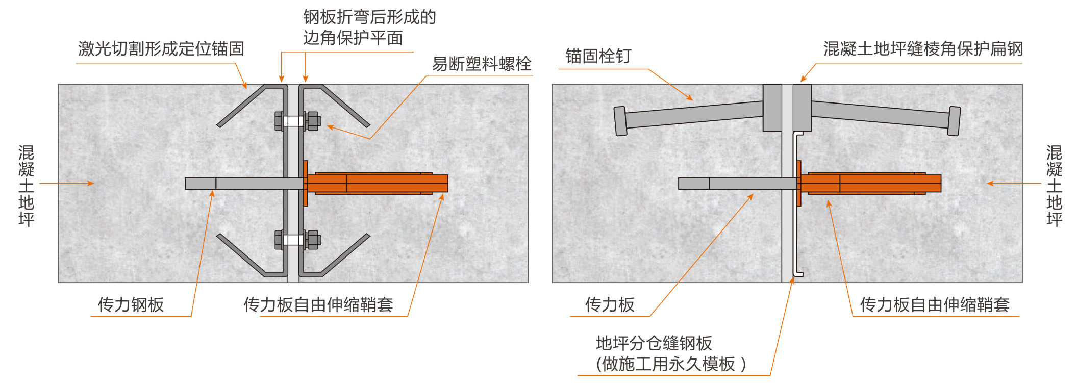 B型鎧裝縫由兩根10*40mm冷拉扁鋼,錨固栓釘,傳力桿/板,傳力桿/板伸縮套,擋料板,易斷塑料螺栓等組成。